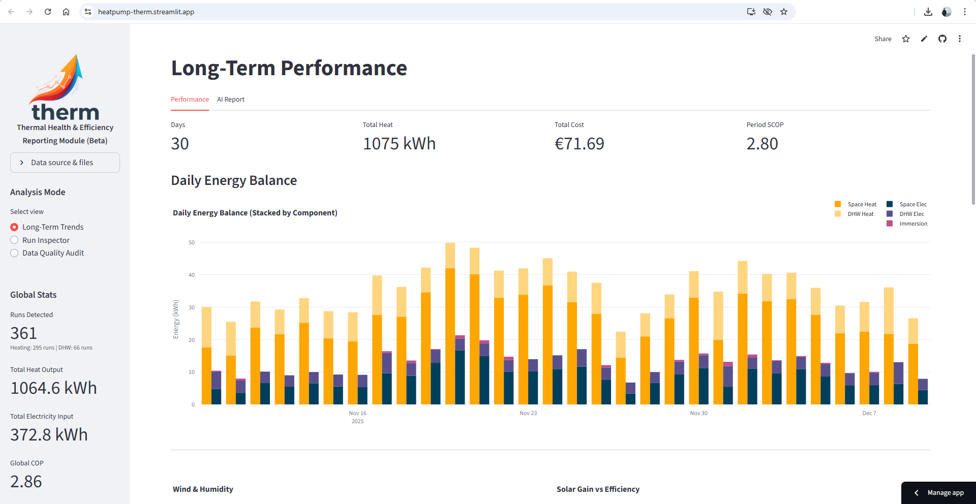 I found the web app very useful to analyse my heat pump data in a structured way in order to be able to generate actionable changes from the analysis and to be able to track changes in the heat pump operation after making changes to the heat pump settings. There is also the option to generate data in a structured JSON format to enable review of the data by a homeowner/person who manages the heat pump (or by AI systems if you choose, but always verify the outputs). This output consistently generates the same metrics which should allow the tracking of potential issues or to track system behaviour following system changes.