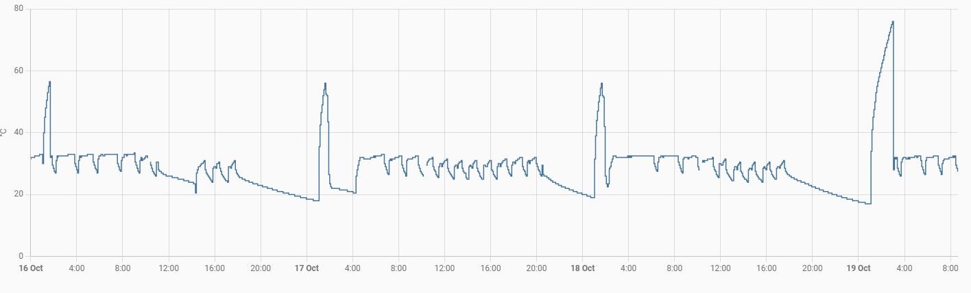 The spikes in your power plot confirm what I thought, although its not as bad as I feared it might be. By way of comparison here is my FT plot, somewhat longer on periods than yours in relation to the 'off' periods. The long off daily is because its still in extended mode and so switches off altogether after a day of solar gain plus the evening cook. This will go soon as I operate on pure WC during most of the season and only use extended mode either end to deal with solar gain. The big spikes are of course DHW including the legionella cycle.