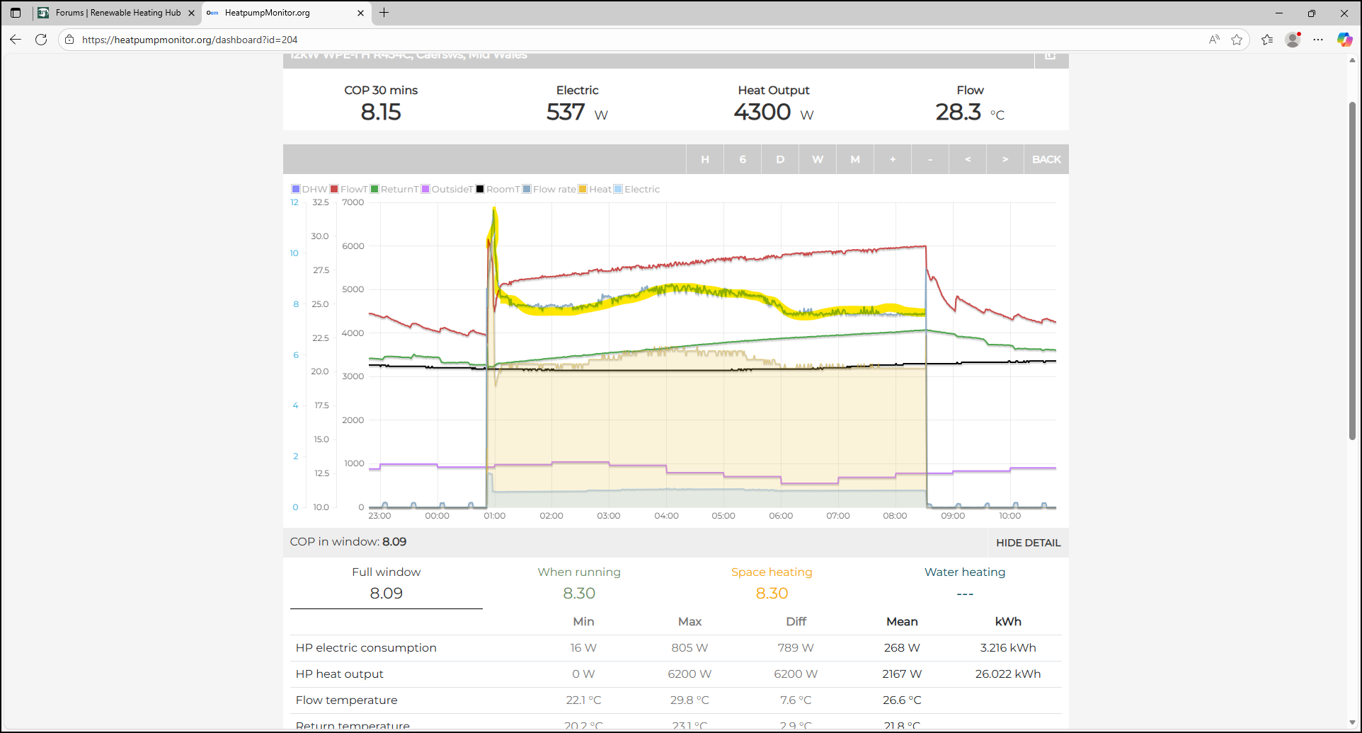 If you look at the flow rate (highlighted in yellow) on my Stiebel Eltron, it varies. This is because my heat pump targets DT6, so to do this has to adjust its flow rate to meet the load. As you can see on the graph, my load was very small, so it could run between 7-9 litres per minute and still give the correct amount of heating for my home.
