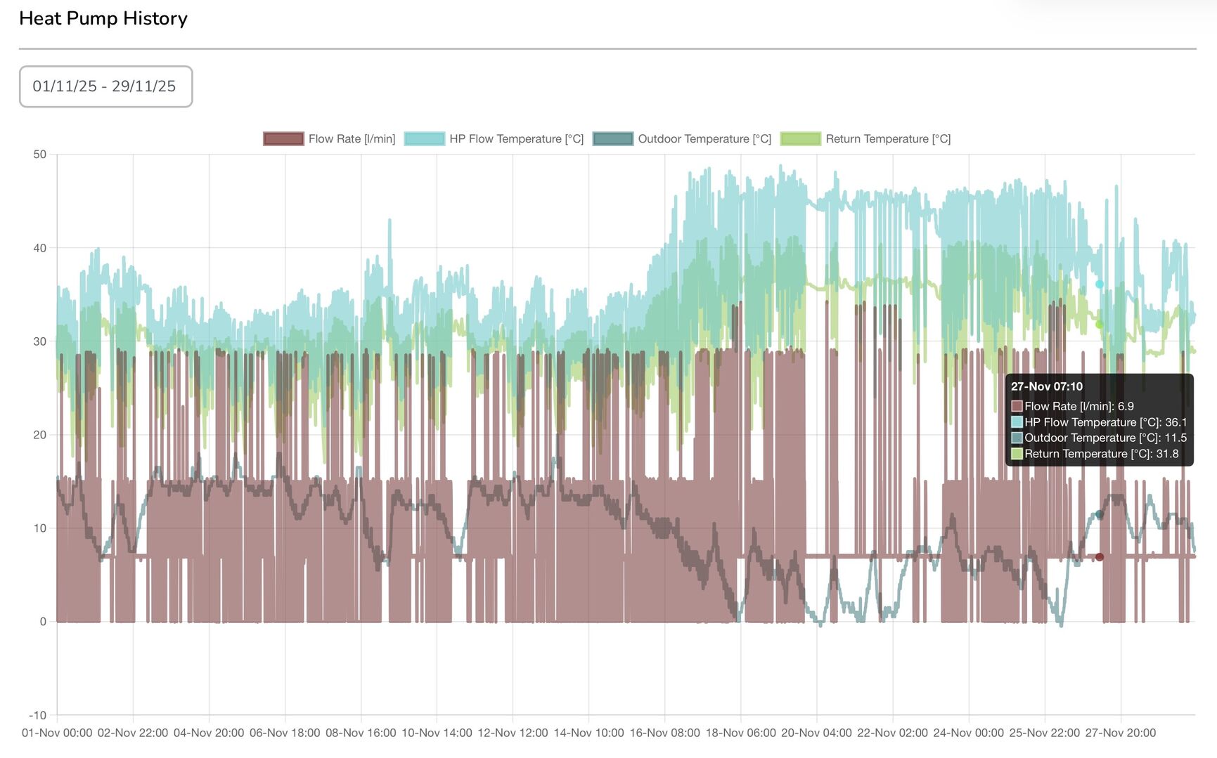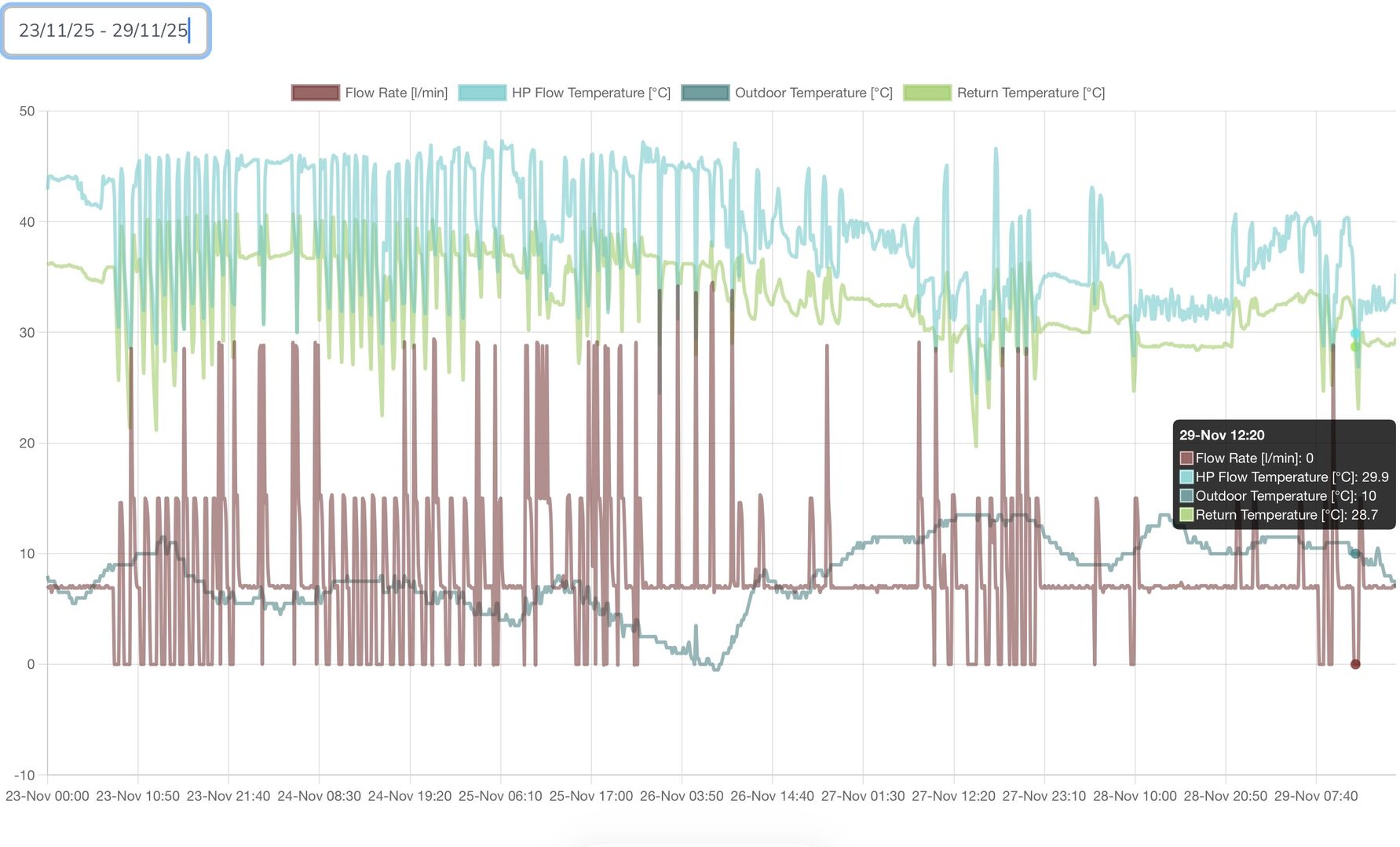 lpm. Of late (during the last month) I have noticed that a flow rate of ~ 7 lpm has become the popular rate for the majority of the time once the system has settled down from starting up. I have now adjusted my Wilo Pico secondary pump on the flow from the LLH down to ~7 lpm from the former setting of ~14 lpm. What (if any) difference this will make to the running efficiency I don’t yet know though. I attach a Homely plot for the month and also for the last week only. Regards, Toodles.