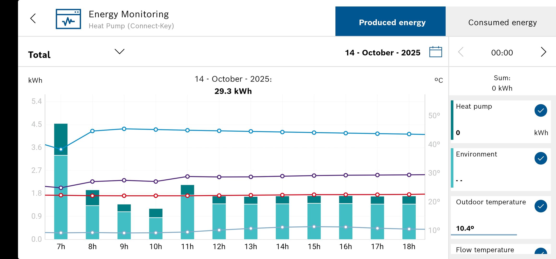 - See hourly data for the last three days, daily data for the last three months, and monthly data for the last three years. This shows consumption/generation, as well as flow/water/room/outdoor temperature, split between central heating, hot water, and cooling.