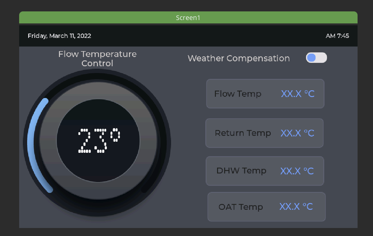 I am currently refining my own smart controller for my Grant Aerona3 R32 as it has practically prehistoric controls I am now addicted to ESP32 devices! I have made a few variants Power over Ethernet, usb powered, purely modbus read write, modbus with relays, Wi-Fi, wired etc and am currently working on a simple user interface on a waveshare ESP32-S3 7 inch touch screen. This will give a simple control to raise or lower the weather compensation curve via the display below.