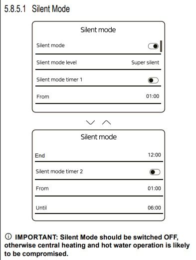 The manual is right about silent mode, it may well compromise heating because what it does is reduce the max compressor modulation, which may mean it cant deliver max output. However as a way to make it quieter at night (and given that @cmartinbwmba already accepts a setback) its potentially an option. This is not the most important thing however, setting it back on the Halo may well be as good, depending on how exactly the Halo works. The most important (for @cmartinbwmba) is to get the weather curve right (in standard mode) and emitters balanced.