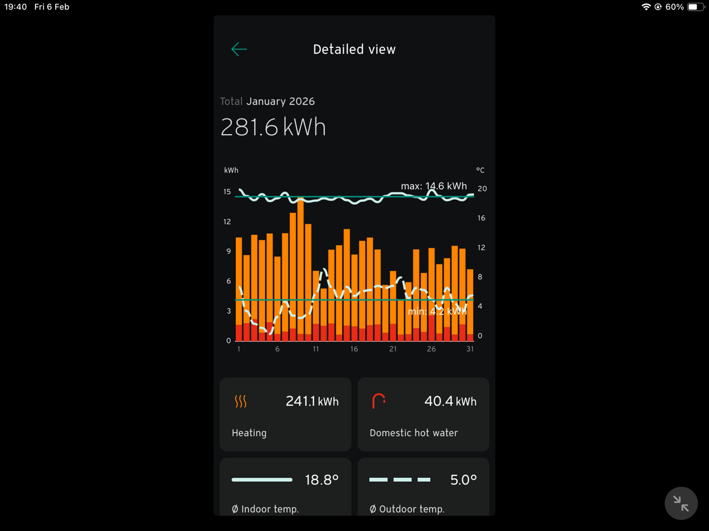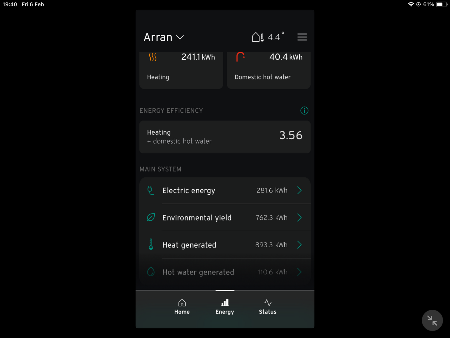 Unfortunately you haven't split out heating and DHW (you really should), which denies us some important information, but an overall COP of 3.6 in January given the ratio of DHW to space heating displayed compares to mine of 3.87 for the two combined, but with a much lower proportion of DHW in my case. I would estimate guess you achieved a COP of perhaps 3.8 for space heating alone, which is pretty reasonable for January, and therefore that you can reasonably expect a space heating SCOP of 4 or more (mine is 4.2). Your heating consumption of 241kWh compares to mine of 907kWh. My house is 7kW at design temperature suggesting yours is actually only about 2kW. This is consistent with 1 start per hour which is definitely OK but not 'top notch' for January,; the heat pump is somewhat oversized but with a 2-3kW loss thats absolutely inevitable and anyway necessary to give you decent DHW reheat time.