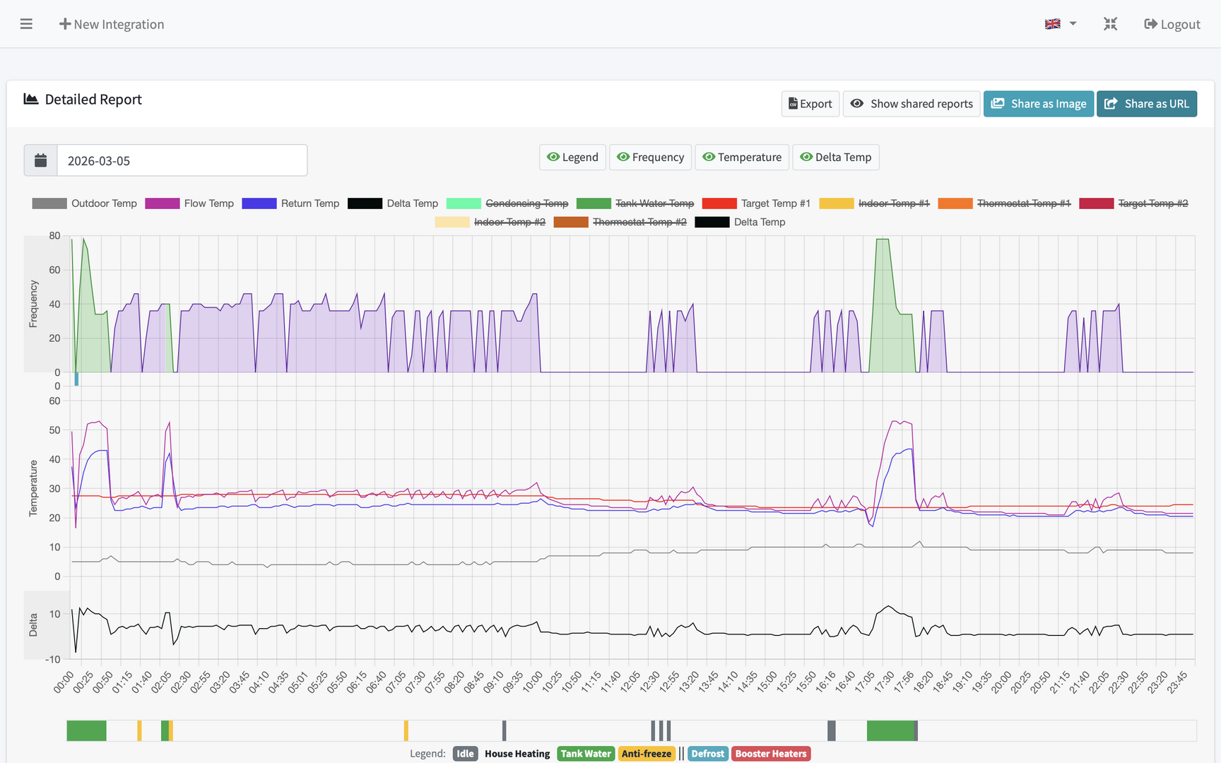 I'm puzzled about the compressor frequency dropping to zero and immediately bouncing back up. Am I right in thinking this is short cycling? At worst it's every 10 to 15 mins. Thinking about compressor life / efficiency I don't think this is ideal? For context the COP during this 24hrs was 5.3 (using external metering - MelPump says 7.42!).