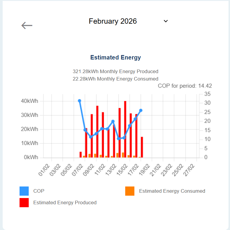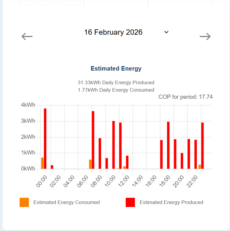 Secondly, it's worth bearing in mind where the energy consumed and energy produced come from. The energy consumed is reasonably straightforward to measure and so probably fairly accurate; it's also easy to measure independently if you choose to invest in a CT clamp. The energy produced, however, involves a little more black magic; the flow rate determines the volume of water moved in a given period and the delta T (the difference between flow temperature and return temperature) will determine the amount of energy released from that volume of water in that time period. Any variations in the flow rate or delta T during that period will affect the accuracy of the estimate as will the specific gravity of the heating fluid (i.e. does the heat pump know it's pure water or a glycol mix and, if so, is it correct in its understanding?).