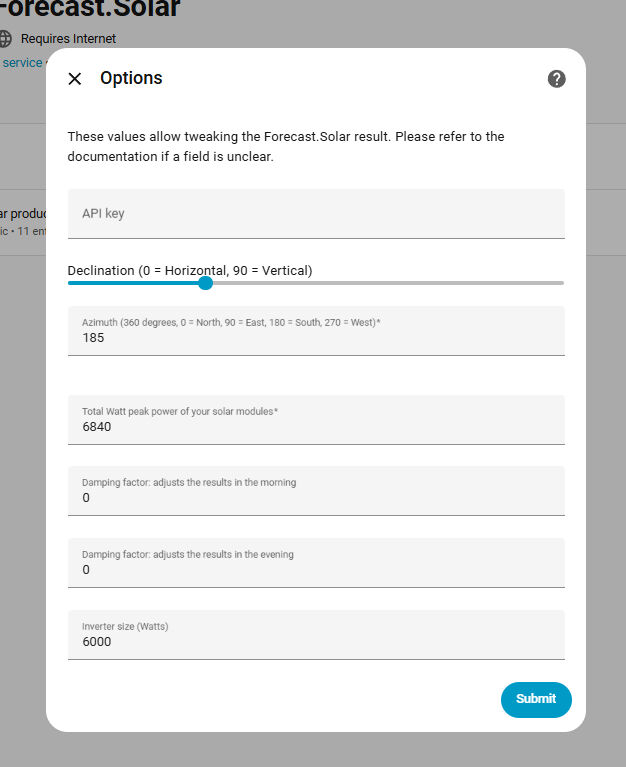 Clicking on the little configuration cog should get you to a screen entitled "Options" where you can tweak the relevant settings (API key if you were using one, direction your roof is pointing, roof elevation, kWp of your panels and so forth). If you leave the settings as they are and just click the Submit button, does that kick it into working?