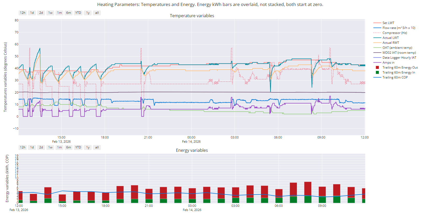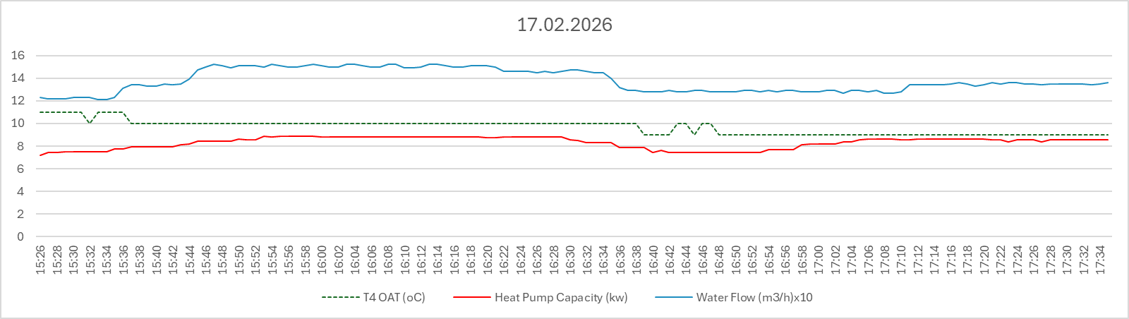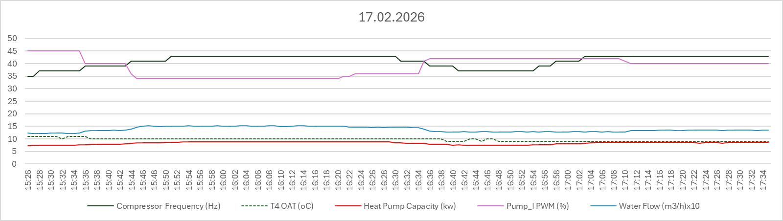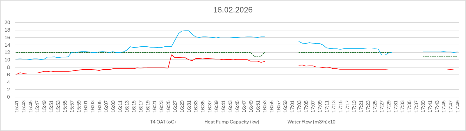 The last chart is again heat output capacity and water flow (x10) from 16.02.2026, for the benefit of @cathoderay , depicting a large variation of water flow values.