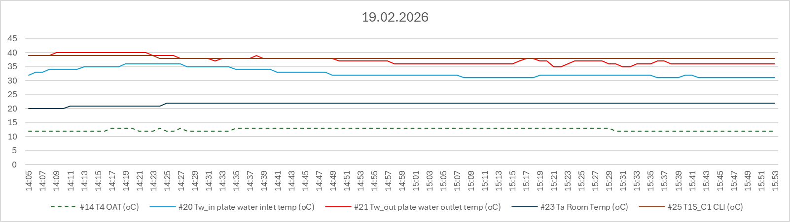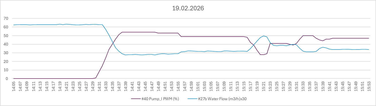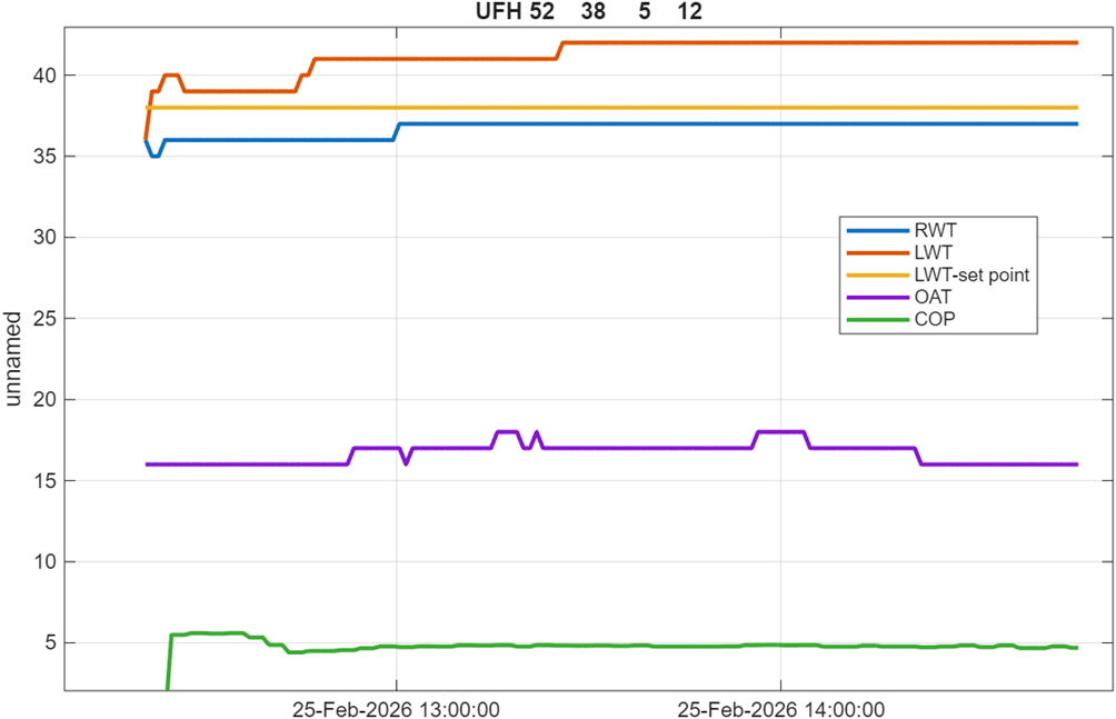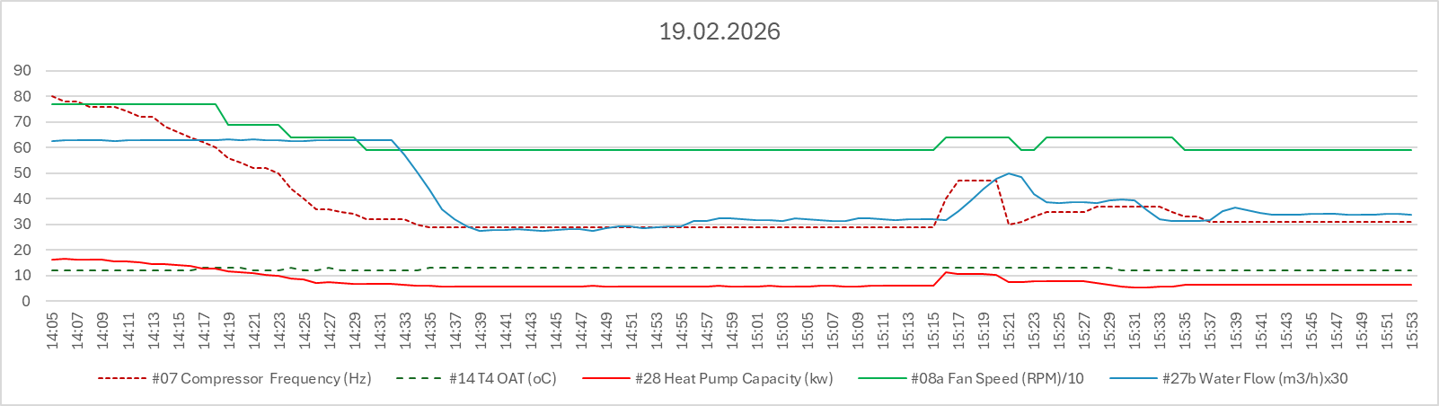 1. Our unit exhibits a wide range of modulation capabilities. The diagram below is based on 2-hour data manually collected, starting almost half an hour after its daily switch on on 19.02.2026 (beware, scaling factors have been applied). Modulation is applied on compressor frequency, fan speed and water circulation.