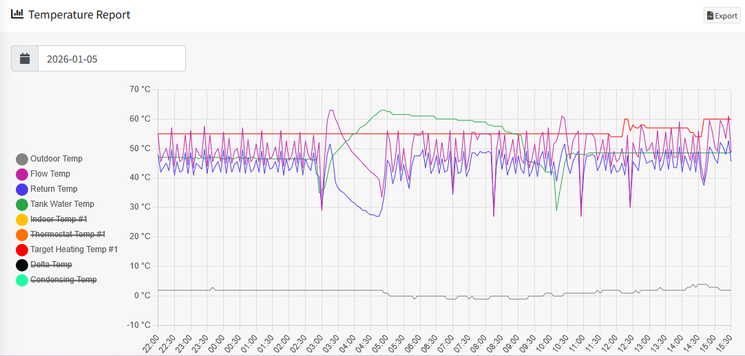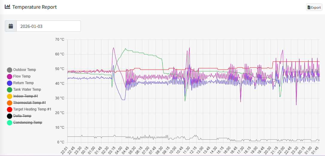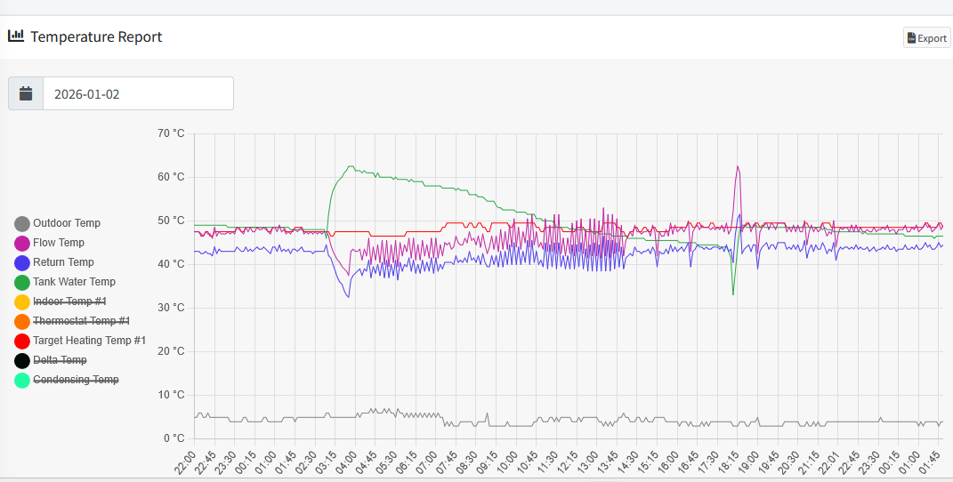 The owners have always struggled to heat the house adequately in cold conditions so I was interested to see what happened in this cold snap. The next day at about 8.30pm I had a message to say that they were cold, as I cant adjust the WC curve remotely, I switched to a fixed flow temperature of 55C. The red line shows the target flow temperature.