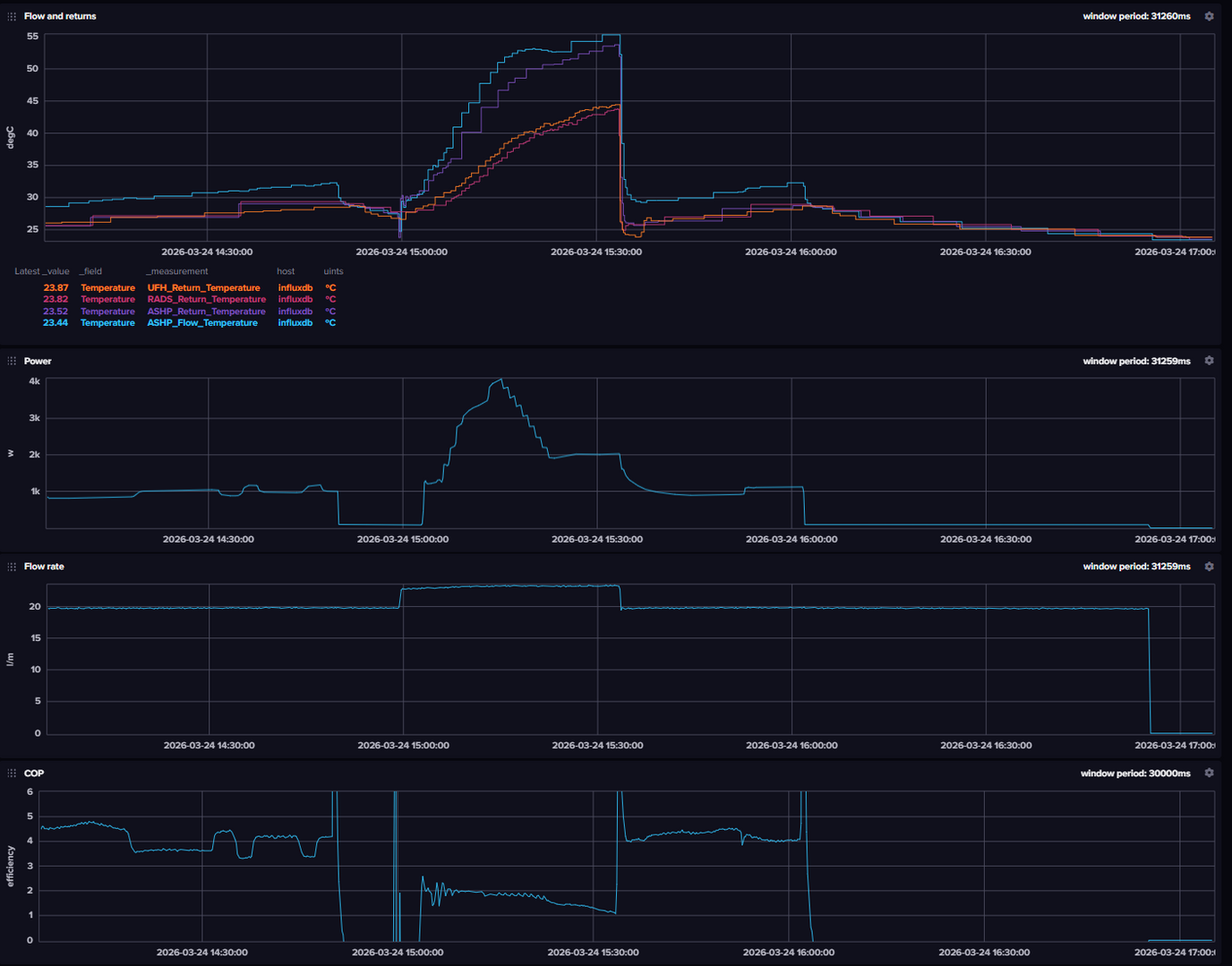 Don't read too much into the temperatures, flow rate or COP - it is a home brewed monitor kit. Nothing was added by the installer! The power is probably accurate it is an iEM2155 power meter.