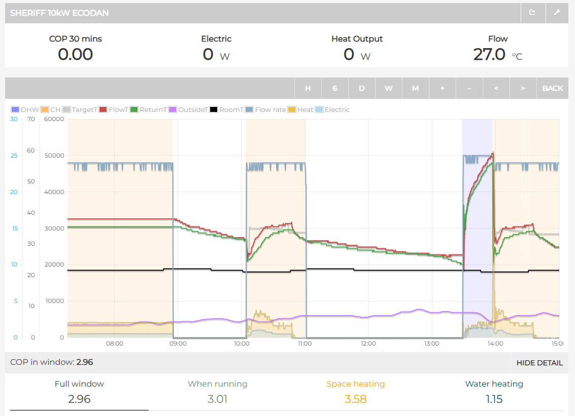 The Mel Pump interactive graphs are a little clearer in showing this than the one I've included above, but there's an issue with displaying them at present. They are helpful in also showing the compressor frequency, so it's easier to spot when the system is running in heating mode but with no actual input power being drawn.