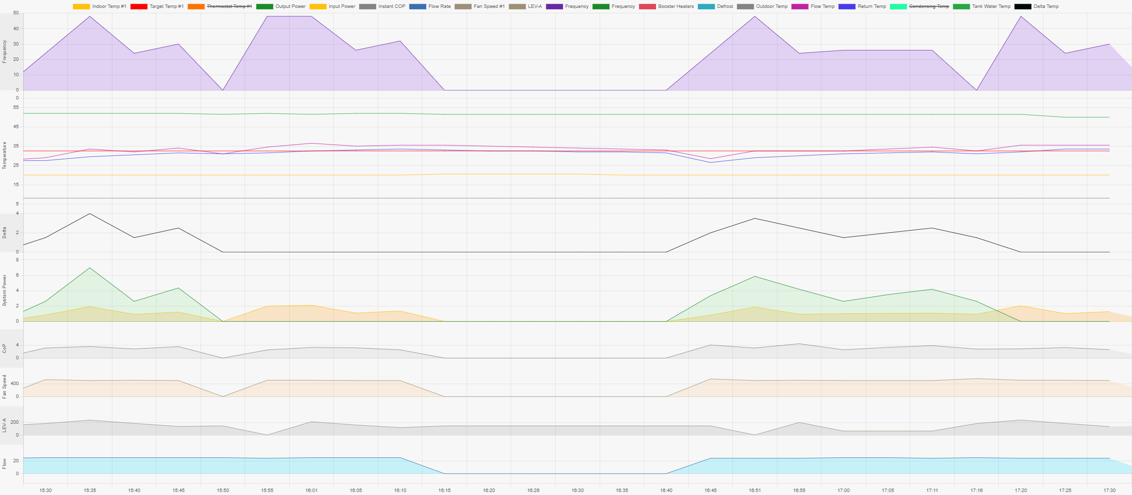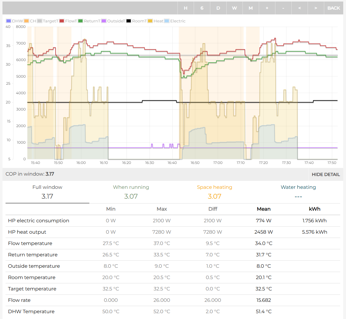 I'd be happy to provide comparative data while you're investigating your own system, if it's of use to you, albeit it's from a system with an overall heating COP of 3.01 to date, so potentially not one that you're looking to emulate. I'll caveat that with the fact that it's saving me around 55% on my energy bills relative to using gas last year, so doing a satisfactory job from a bigger picture.