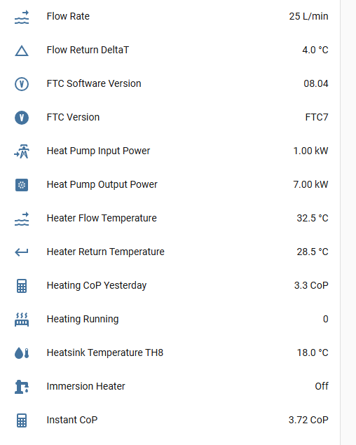 The other obvious limitations are that flow rate is reported as a whole number and the delta T always reports with 0.5°C granularity, which will introduce rounding errors into the calculations, but nothing to the extent that the figures would become unreliable. It will just introduce an additional margin of error into the reporting.