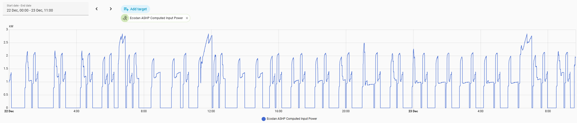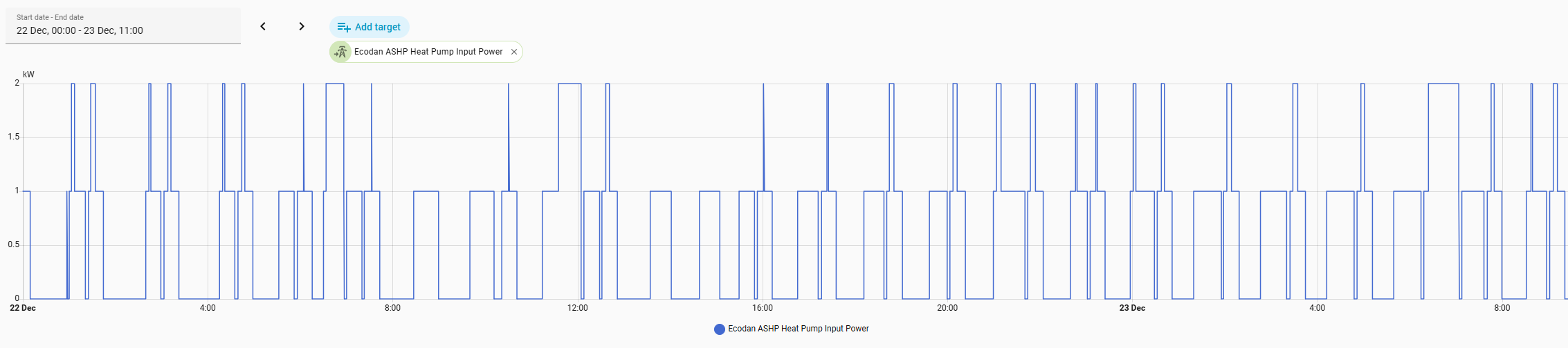 Within the list of data that it spits out there are two items listed as Heat Pump Input Power and Heat Pump Output Power, which immediately gives the impression that you're getting exactly the info you want. However, both only seem to report in full kWh, as the graph of recent input power shows.
