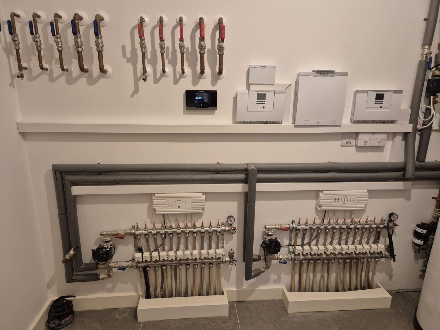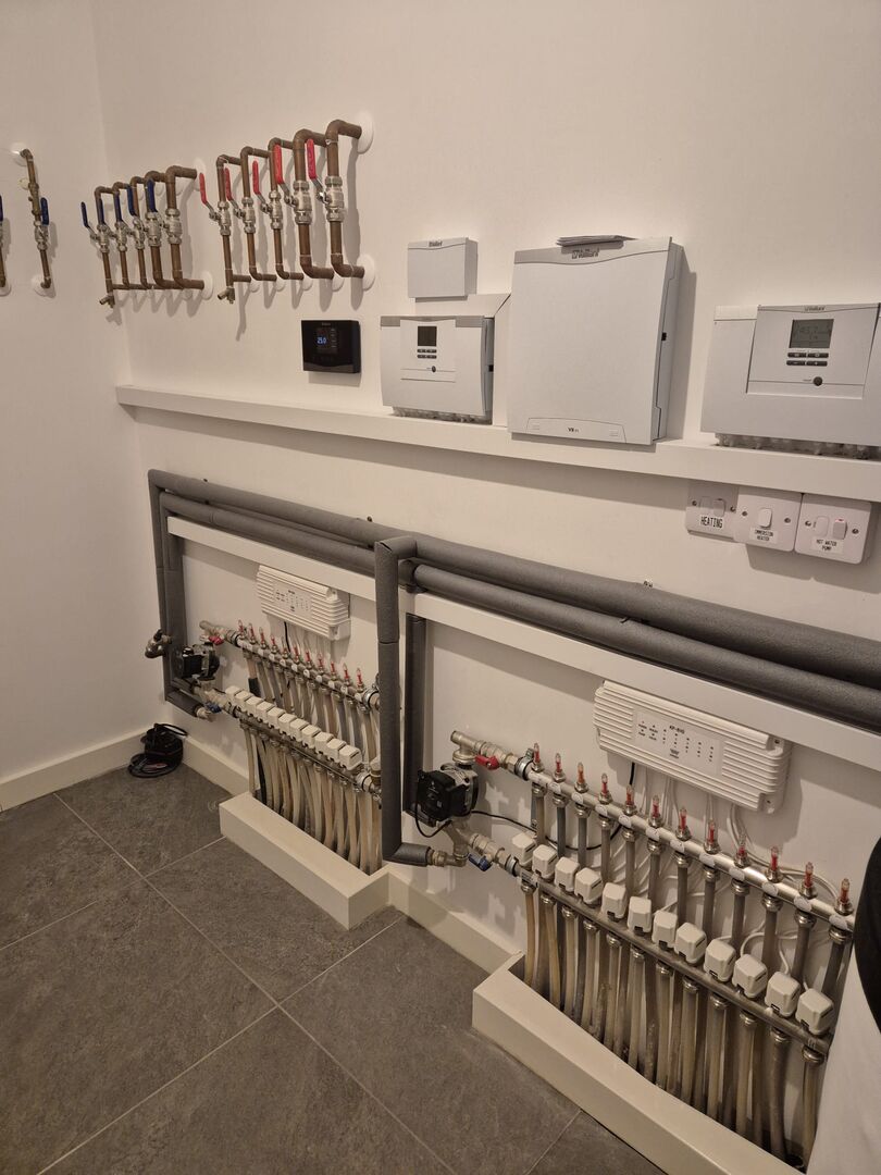 Grant Aerona 290 15.5kW, Grant Smart Controller, 2 x 200l cylinders, hot water plate heat exchanger, Single zone open loop system with TRVs for bedrooms & one sunny living room, Weather compensation with set back by room thermostat based load compensation