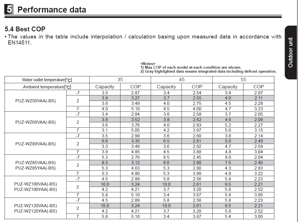 Thanks to this forum, I'm also aware from my initial research into selecting a heat pump system that the power 'badge' on a heat pump has the potential to be hugely misleading, and that the data tables for each individual heat pump are the only way to get any proper insight into this, so I've spent recent days searching out some more information on my particular model.