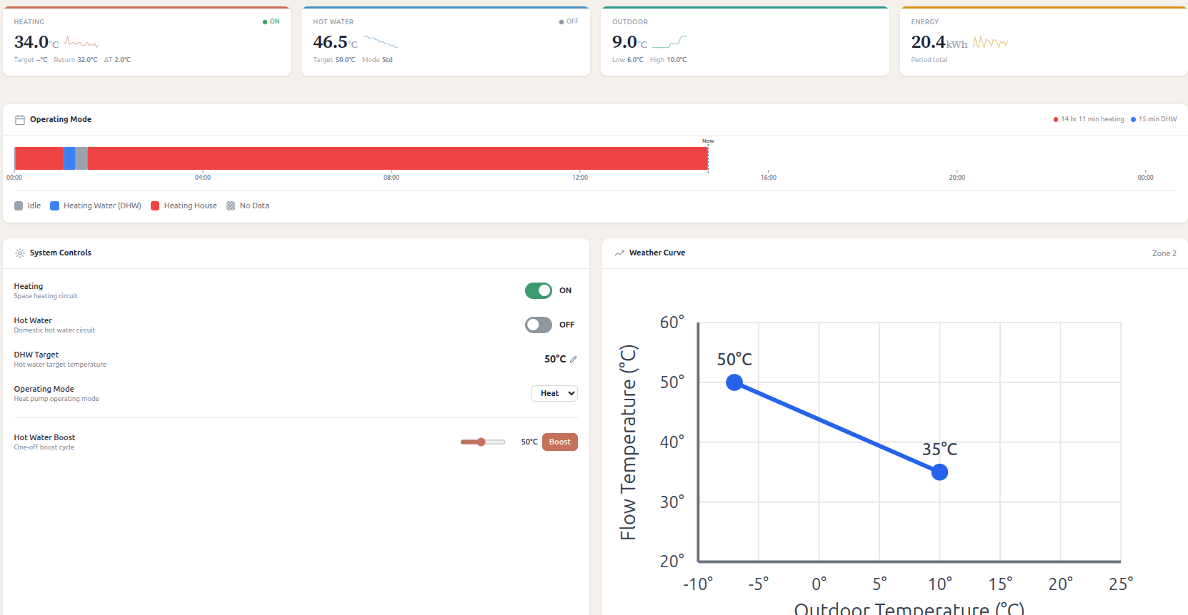 @jamespa Many thanks for the note and ideas. the system is now in full auto mode on Water Law. Using the previous method then with the temp as reported by the indoor controller showing 23 degrees the house is OK (complaints have stopped) It will be interesting to see how the power usage looks after a few days. Today is a great solar day so a very cheap running day!