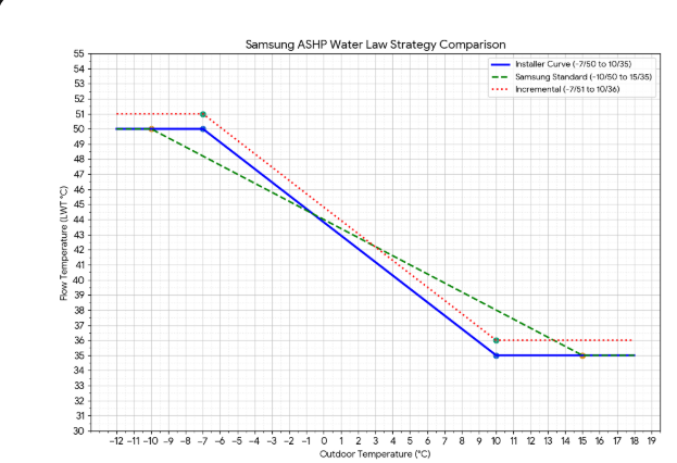 Samsung is a much gentler curve with the incremental one being the most aggressive and 'hottest'. This was the installer strategy it seems. Change WL settings up by 1 degree at top and bottom. At curent 7 deg ouside the Samsung curve would already be hotter by almost 3 degrees.