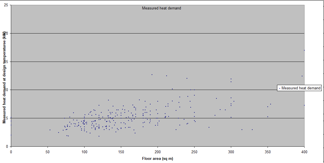 - It would be good if you could narrow down that loss uncertainty. Is there any useful evidence available from gas /oil consumption? 11.5kW is big unless your house is well over 200sqm, as the scattergram below of measured consumption vs floor area from the 250 or so systems on heatpumpmonitor shows