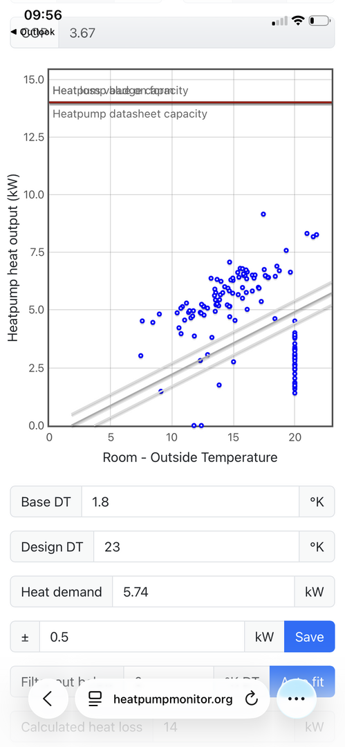 Here is my results from heatpump monitor.org. Not sure what the vertical line of points at 20 degc is about and it seems to be skewing the line. But the general scatter suggest about 8kw heat loss at -3