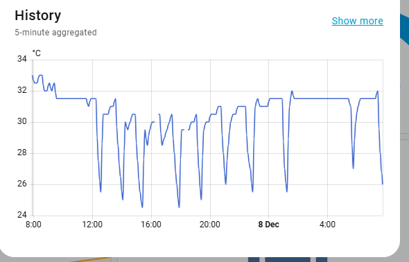 Yesterdays run 8th Dec. Chart is showing flow temperature. The HP didn't like a set temperature of 29C. Very little on periods. Lots of temperature overshoots, level run point was about 40C as per 4/5pm. Plus 2 defrost cycles even with an outside of 12C. Bungalow this morning 21.5C.