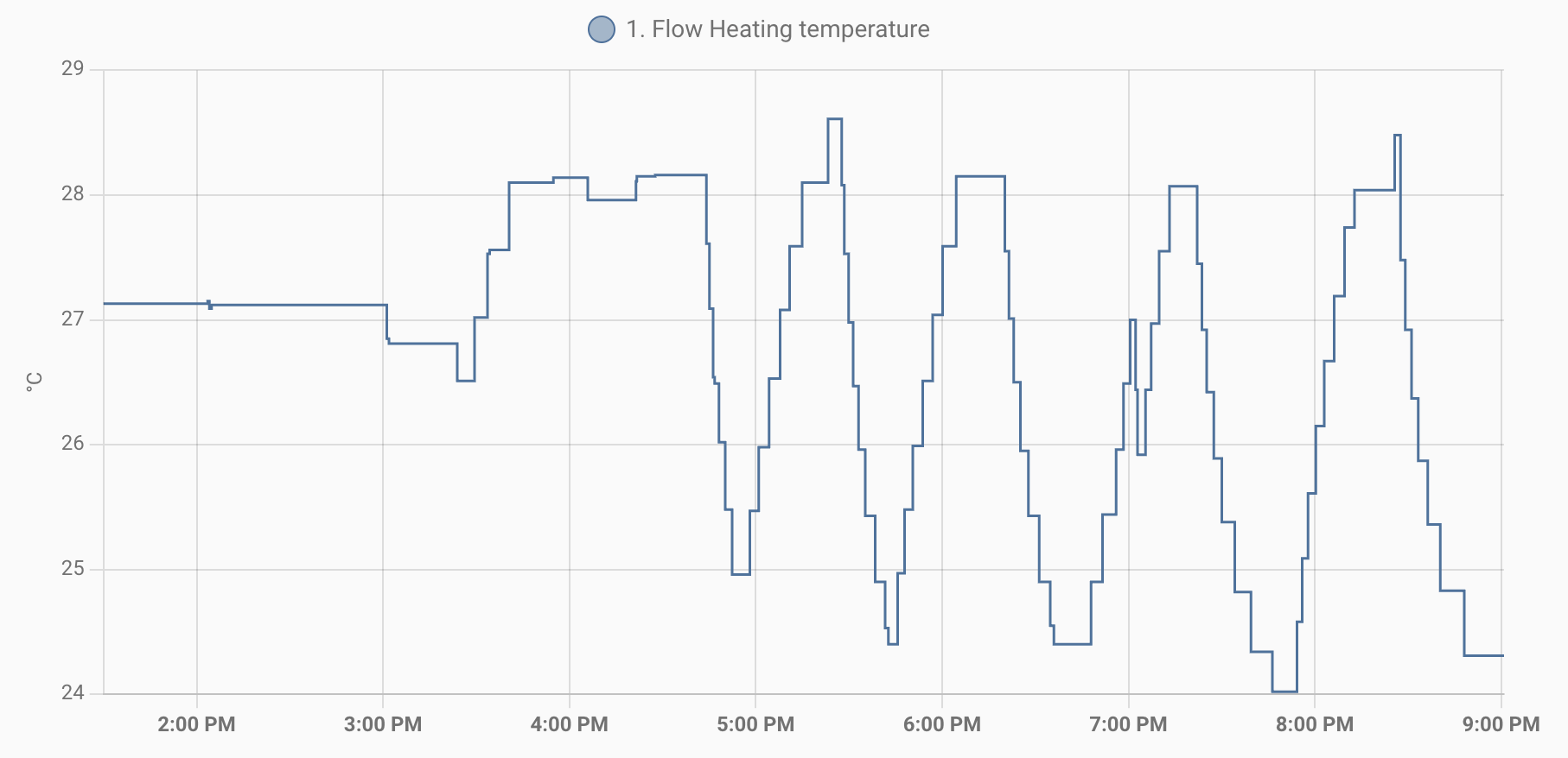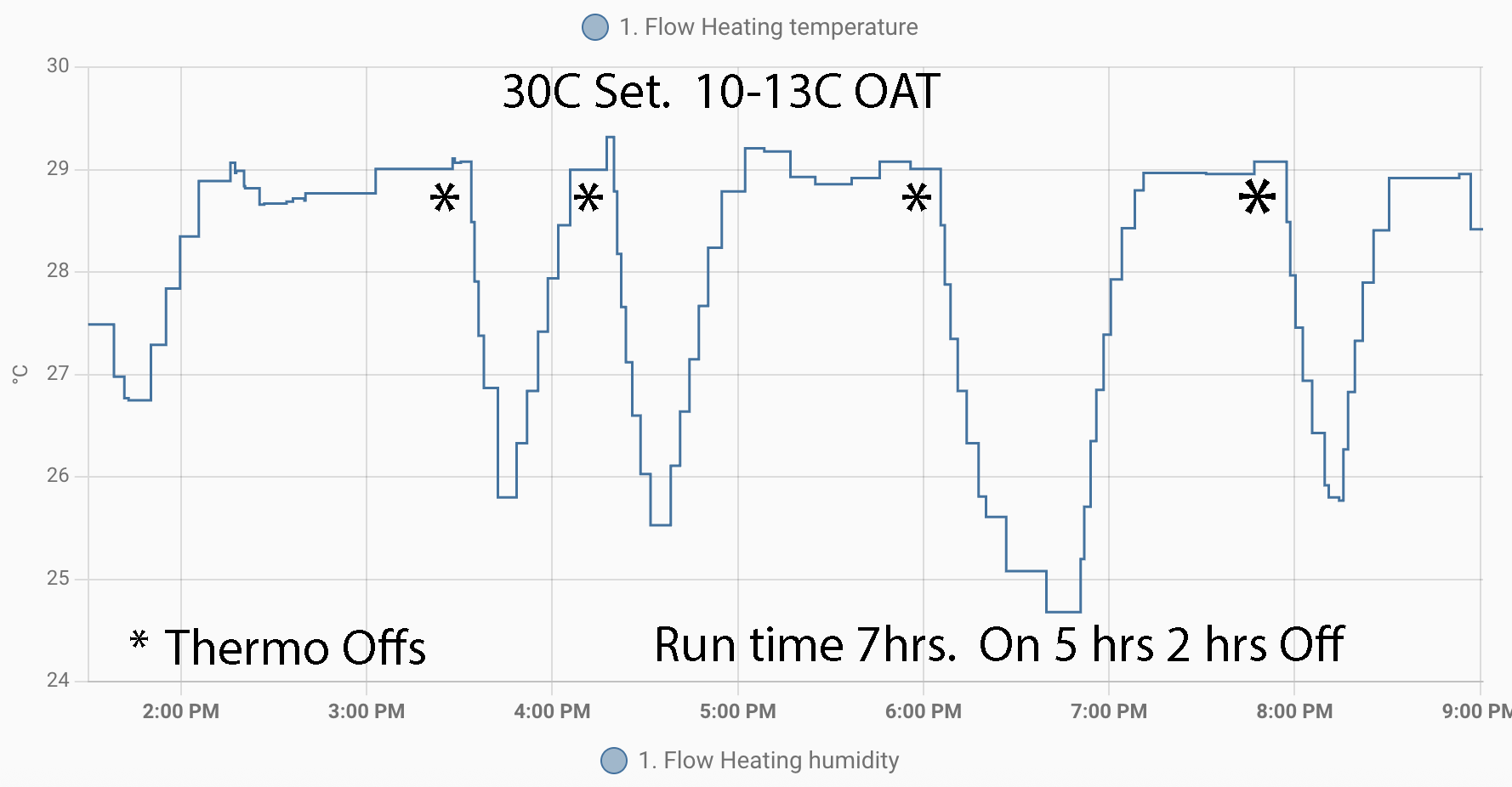 Below is the actual flow chart for yesterday. You can see it's hitting its target set temperature of 29C (my probes record about 1C less). It does show a lot more off time than on.