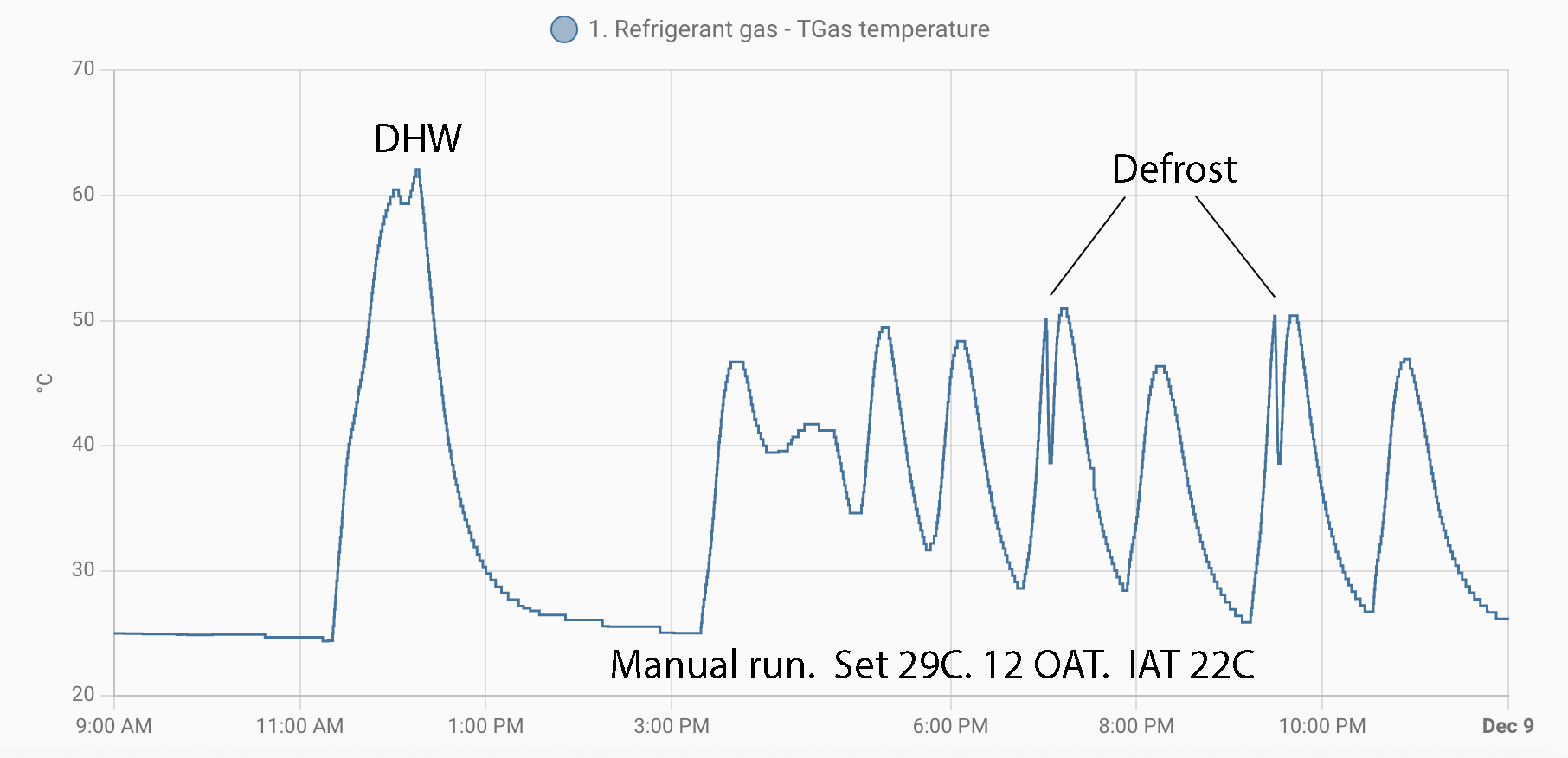 You can also see how the temperature rose during the evening as the OAT was falling. Also a deep defrost at midnight, prior to the DHW cycle, following the DHW cycle and then again at about 7am.
