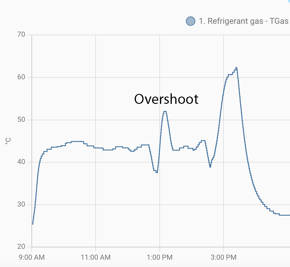 I have noticed these overshoots in refrigerant temperature before. They seem to occur more at low setting temperatures. Below is an example: