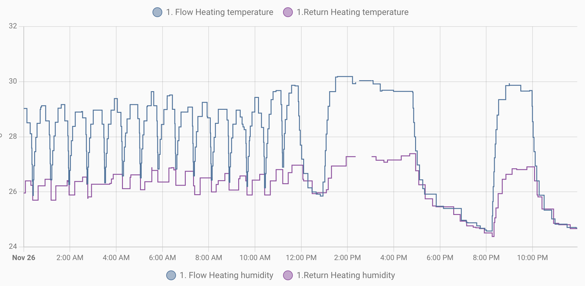 Yes a set temperature of 31C works when cold and mild like today. (BTW no heating has been on since last night, house is still warm from the last heating cycle, tomorrows chart will explain).