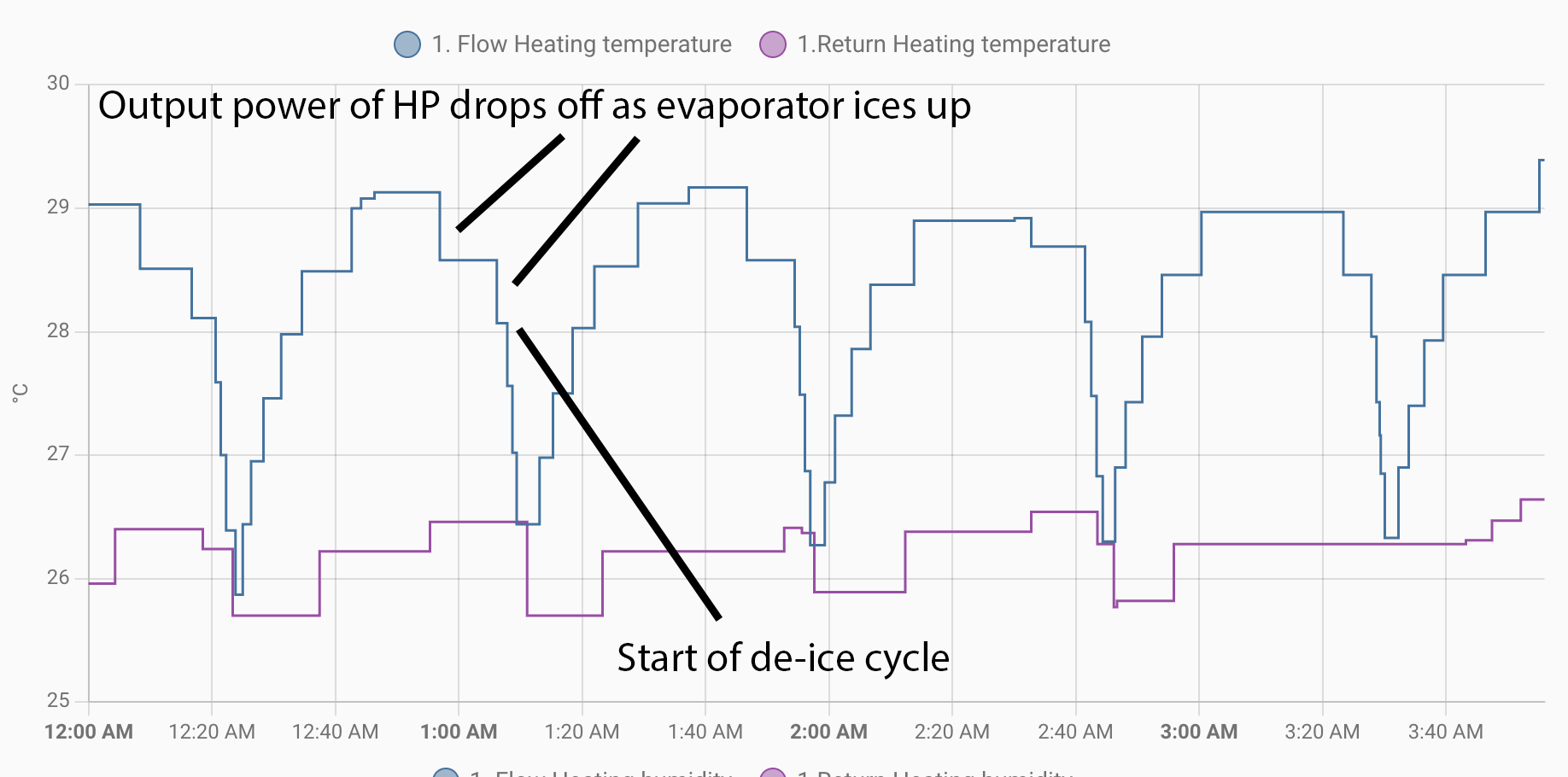 The defrosts look normal except that the flow temp doesnt get back to 31. Yet the gradient of the rising edge is the same as immediately after the defrost and your expanded plot where you explain whats going on shows it level at the top not continuing to rise until the next defrost. Also the temp it reaches starts rising again for the last three of the defrost cycles, which wouldn't obviously be the case if something is 'wrong'.