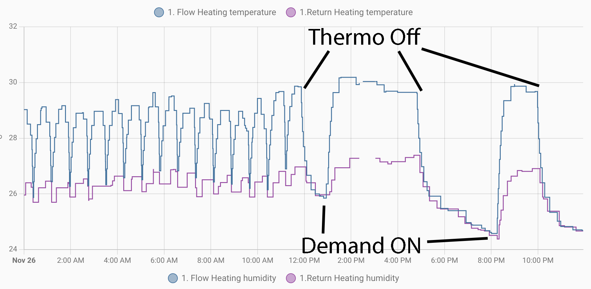 What happened between 6pm and 8pm and after 10pm (is this what "The off periods are: Hitachi Thermal Off Rule (short cycle) - Takes a shapshot of the water into the heat exchanger (Twi). Twi needs to drop by 4C to put demand back on." refers to - if not what does it refer to - this isnt a short cycle its a long one!