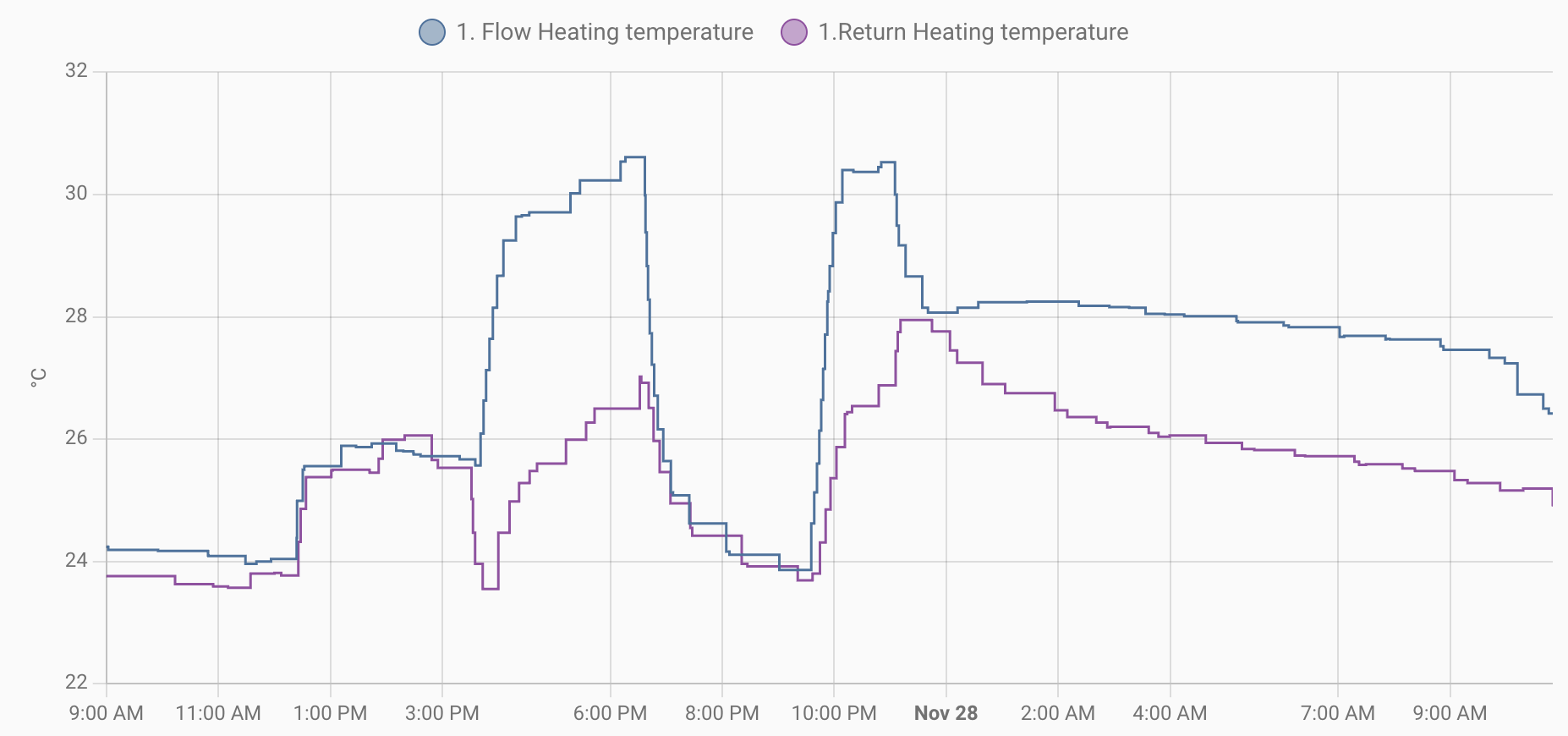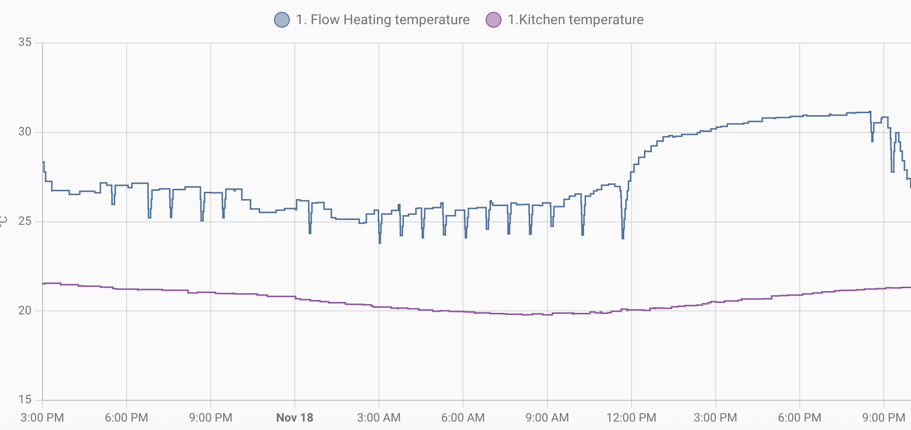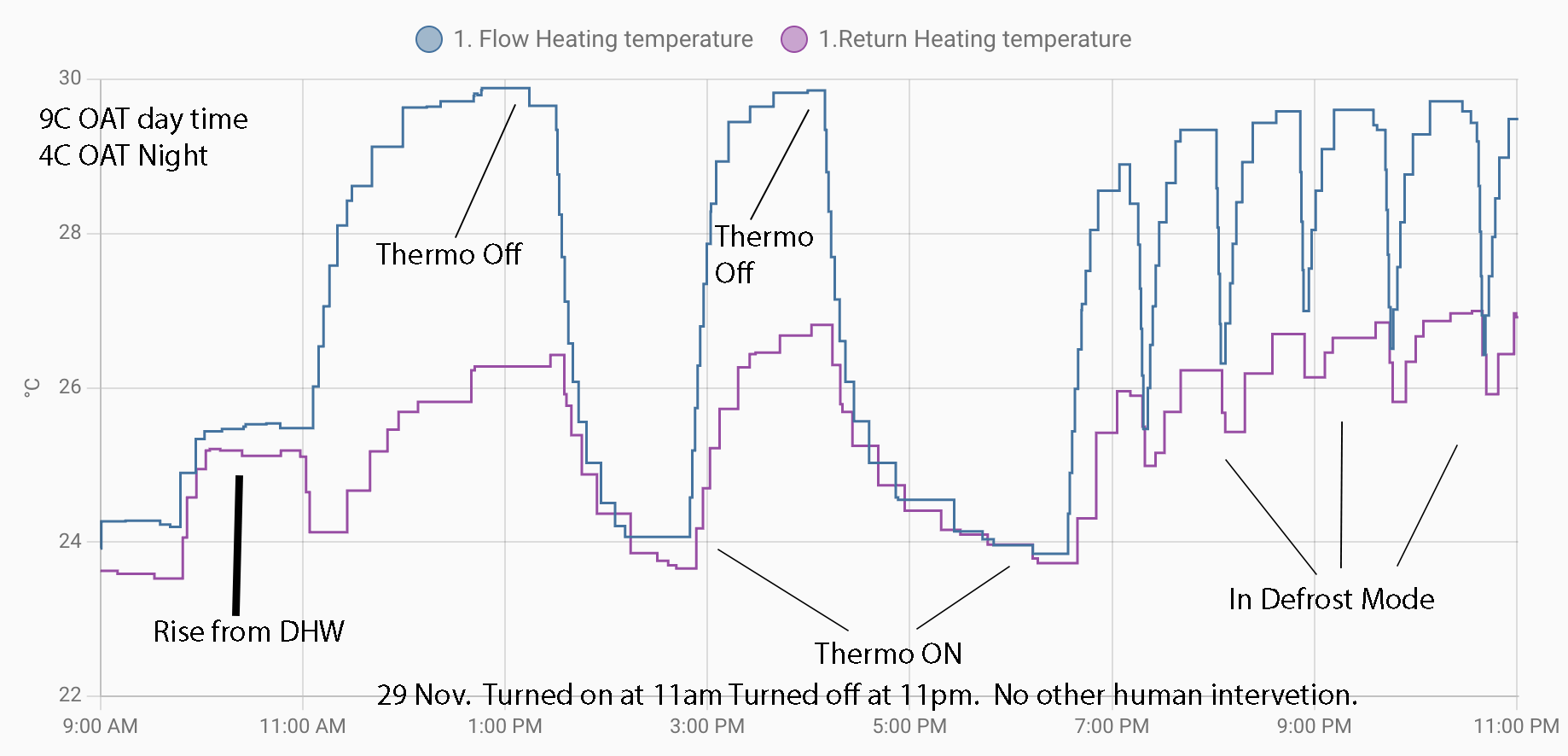 No, the fact that flow temperature reduces by ~3-4 C during nighttime hours (I havent yet worked out the exact hours) regardless of whether defrosting is occurring. Until you posted your latest graph it was at least plausible that this was caused by defrost, even though the evidence wasn't quite consistent. Your latest graph shows the reduction but no defrosts.