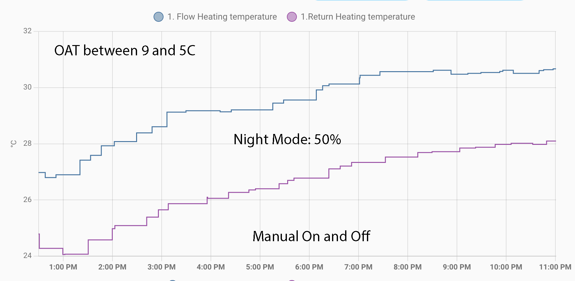 I have always expressed the view that the HP is oversized, as you have found the Night/ECO setting, I turned it down to 50%. This is the result.