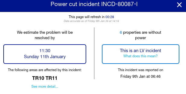 Our DNO has updated our restore time to 21:00, after the initial update that said we’d be back by 10:00.