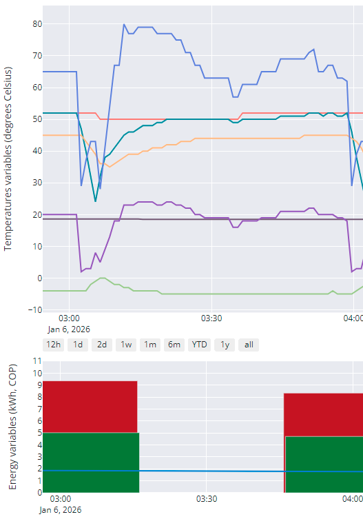 That’s an interesting stat. I’m thinking that the 0.1 KWh might be the energy used during the flow reversal process….? I’m also thinking that the real energy which provides the heat for the defrost isn’t recorded during the defrost because it is the hot water which is already created and stored in the radiator circuit. Is it possible that the 0.1kw you refer to plus the 1 kWh water heat to provide the defrost was created at a cop of circa 3.8 and would result in the total energy for the defrost?