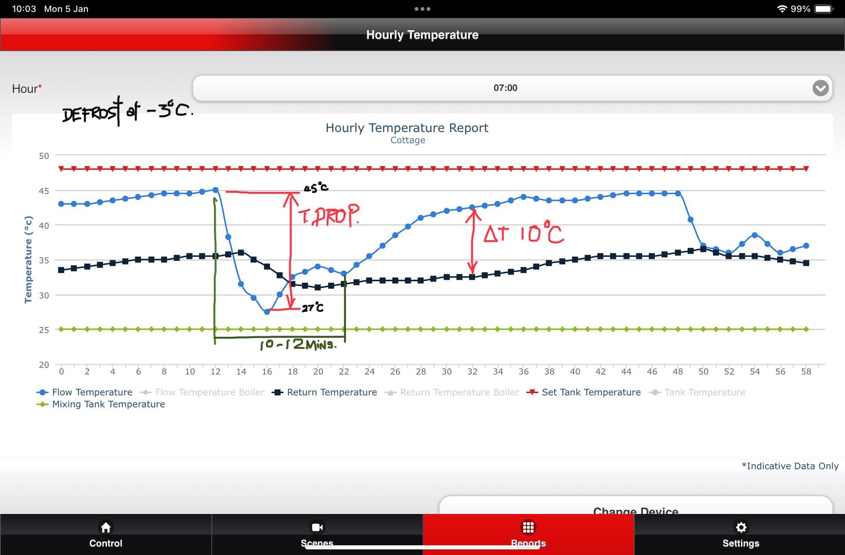 2. The chart doesn’t graphically represent the 180 litres of chilled water which has entered the heating system in the 12 minutes of defrost. (12 minutes X 15 ltrs per minute flow rate)