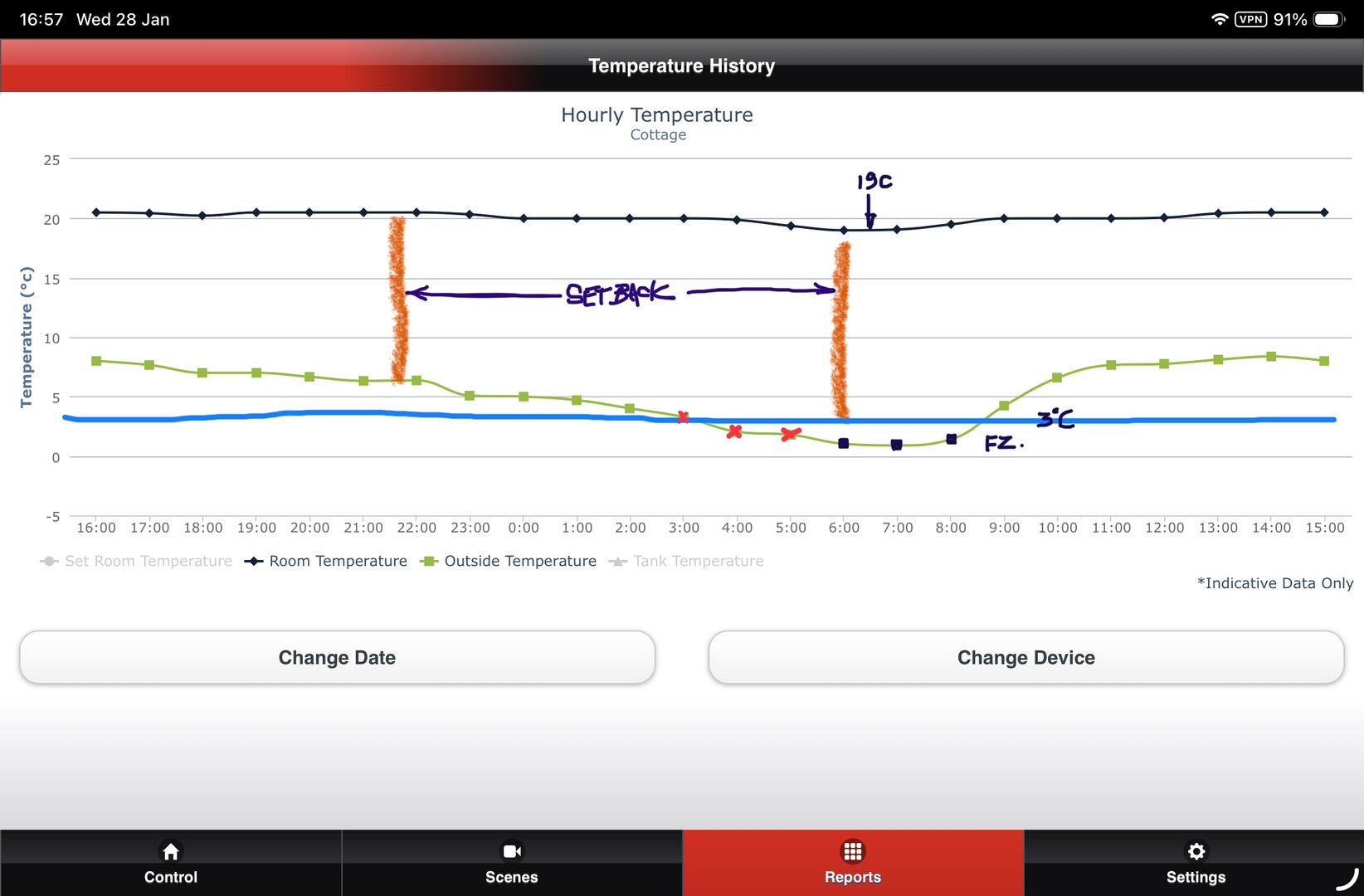 The problem is, unfortunately, none of your charts show energy use. You know that I am predisposed to the common sense idea that setbacks save energy/money (obvs innit) but I also accept the physics says it is not that simple. Then there are effects such as the finding that while defrosts impair efficiency, they may actually consume less energy than normal running (they are complicated, because on one level a defrost is a mini setback). What all this means is that we can't just use obvs innit arguments to say setbacks save energy, we have to show they save energy. Because of the complexity of analysing observation data (the need to compare like with like problem) I now believe the only way we can get a definitive answer is on a property by property basis (and it would be useful over time to have data from a variety of properties) where we compare 24 hour periods with very similar environmental conditions. Last spring (2025) I used setbacks, this spring I am not. I am hoping that despite Mother Nature's capacity for infinite variations, there will be enough matched pairs of 24 hour periods (one from last spring, one from this spring) with similar enough OAT profiles to mean that a direct comparison is valid.