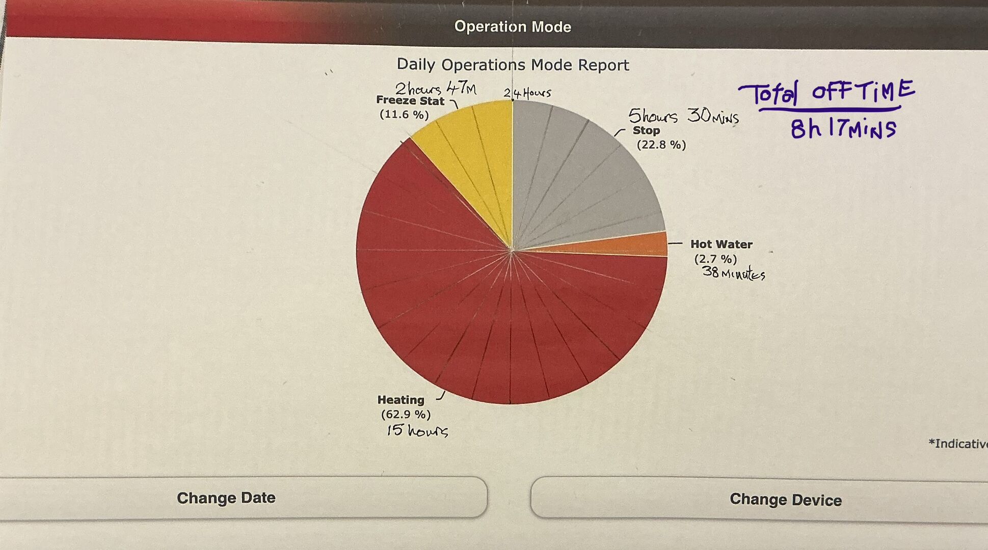 here is a pie chart of the 24 hour operation where the setback period is made up by an off period and a freeze stat period (the freeze stat period didn’t require a temp boost and it just circulated the the water system.
