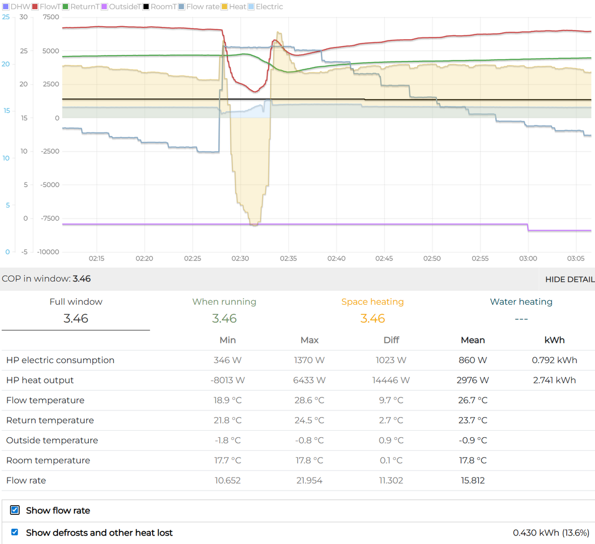 The Grant with flow rate, clearly showing the increase while defrosting (grey line):