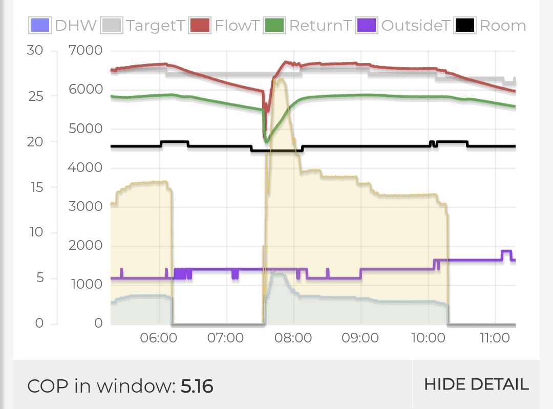 The 'COP in window' is still impressively (suspiciously?) high for an OAT of 6°C. It is also as you say a very low peak flow temp given the OAT. Can you throw some light on how you achieve that? UFH?