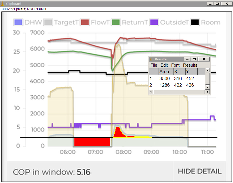 * the saved rectangle represents 0.5kW x 1.5h = 0.75 kWh. The area is 3500 pixels, which gives us 1 kWh = 4667 pixels, which means the extra energy used during the recovery was 1286/4667 = 0.28 kWh, giving a net saving of 0.47 kWh for the 06:00 to 10:00 period compared to running without the off period.