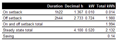 I reverse engineered your 1.98 kWh to get the mean rate for the off setback period. How did you determine the 1.98kWh figure, as it is the major contributor to the off/on period energy use?