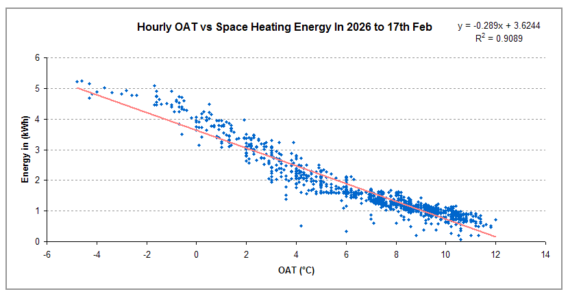 That is certainly one approach, and it is hard to argue that the power in use was 520W +/- 3W at 6°C OAT on Friday 13th, lucky for some on this occasion, when nature was kind. But does that mean it will be 520W +/- 3W at 6°C on Sunday 9th March? Nature can be fickle. I find the power use varies even for the same OAT. Given the relationship between OAT and (power and) energy in is tolerably linear (energy out isn't because it is affected by changing efficiency), I prefer to plot one against the other and then use the equation to calculate the energy use (energy rather than power because that again is what we are actually interested in). Here's my OAT ve Energy in for 2026 to date: