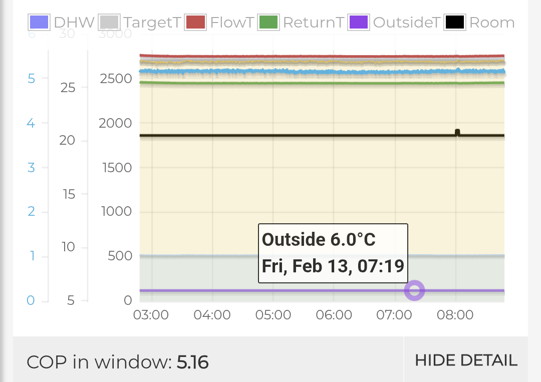 The 'COP in window' is still impressively (suspiciously?) high for an OAT of 6°C. It is also as you say a very low peak flow temp given the OAT. Can you throw some light on how you achieve that? UFH?
