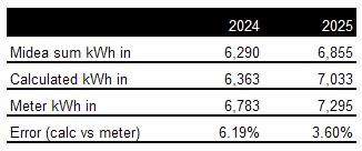 Note that I consider my own energy in monitoring is far from perfect. I calculate it from the amps and volts in as reported by the wired controller over modbus. I do have a kWh meter that supplies only the heat pump, but it is manual read only, no modbus connection. However, using manual readings, I have established that on average the amps x volts x time estimate is less than the kWh meter value, and needs a correction factor of 1.18 to bring it into line with the kWh meter reading. Even then it is not perfect. Here are the values for 2024 and 2025, Midea sum is based on the Midea cumulative kWh used value, Calculated is my amp x volts x time x 1.18 correction factor, Meter is the metered value: