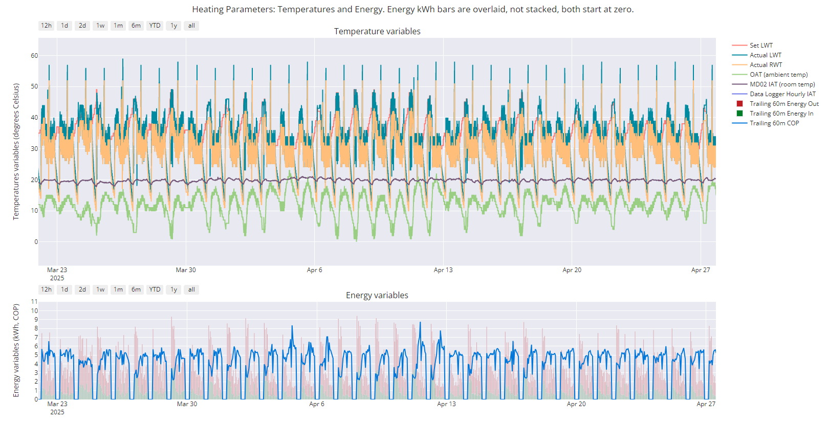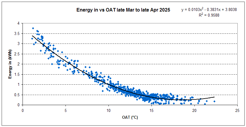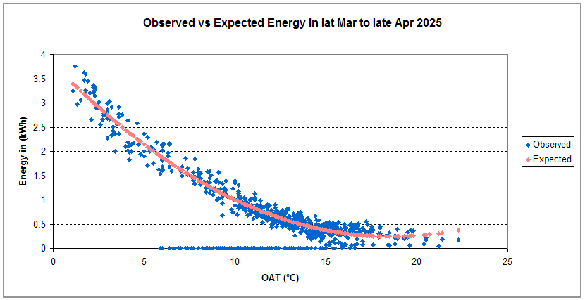 I have now done the analysis, but not for November 2025, because I forgot I wasn't running a setback then. Instead I did it for a period in March - April 2025 when overall I had reasonably stable conditions, but with 2100 to 0300 overnight setbacks, and a reasonable spread of OATs (outside air temperatures). This is what the basic data look like: