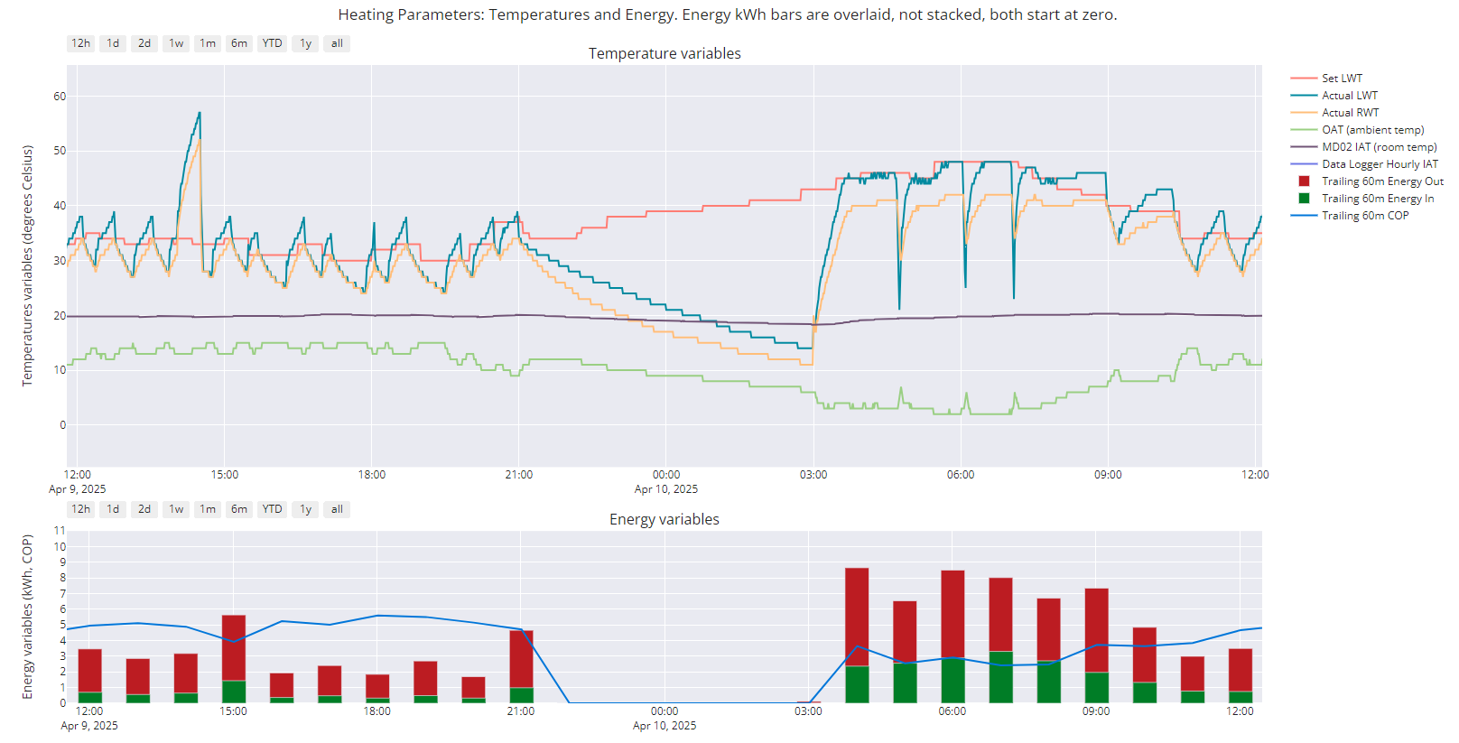 As noted and indirectly shown above, the COP isn't constant. In fact it can halve, as we can see here in the data plot for the relevant 24 hours (again a repost for ease of reference):