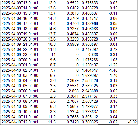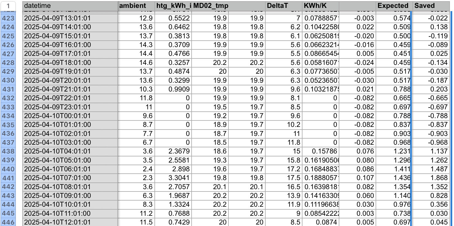 The columns are datetime, OAT, Observed, Expected, Observed - Expected, Sum of Observed - Expected (bottom right). Apparently I saved 6.92kWh that night by using a setback.