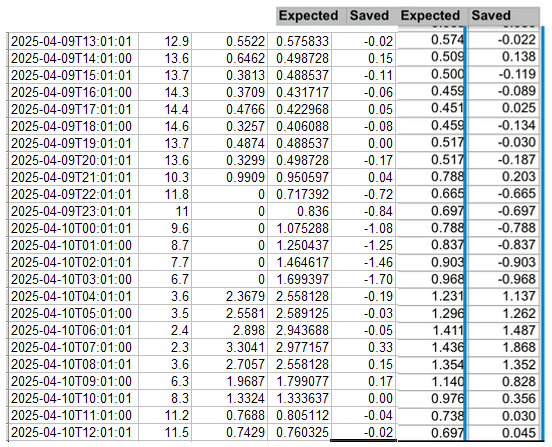 Up until 2100, when the setback starts, the differences aren't huge. But during the setback, and afterwards during the recovery period, when the OAT was lower and the in-out delta t greater, your and my expected values diverge considerably, with your expected values being less than mine. This happens because the constant kWh/in-out delta t value is too low at the lower OAT/in-out delta t values during this period.